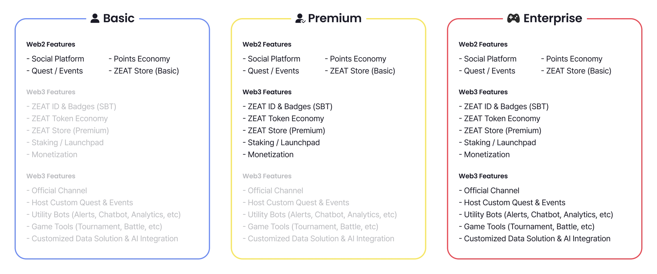Basic – Includes essential features, including full access to the social platform, quests and events, points economy, and the ZEAT store.